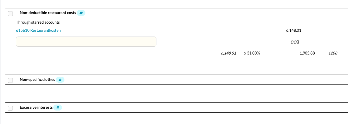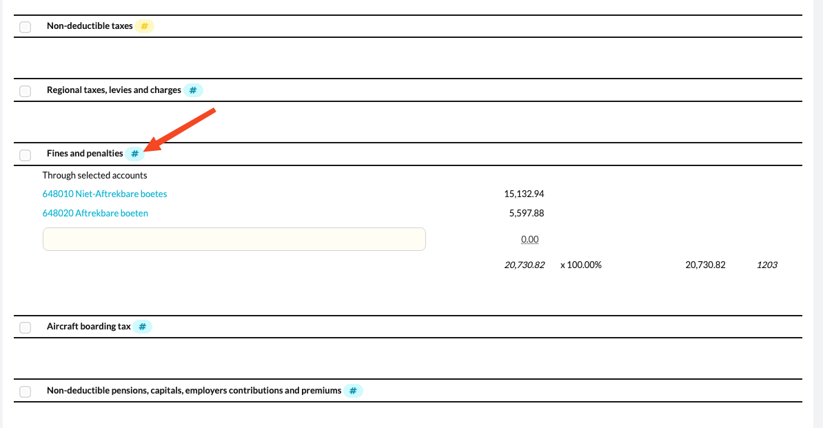 After that, you can indicate for each entry to which category of disallowed expenses the amount belongs.