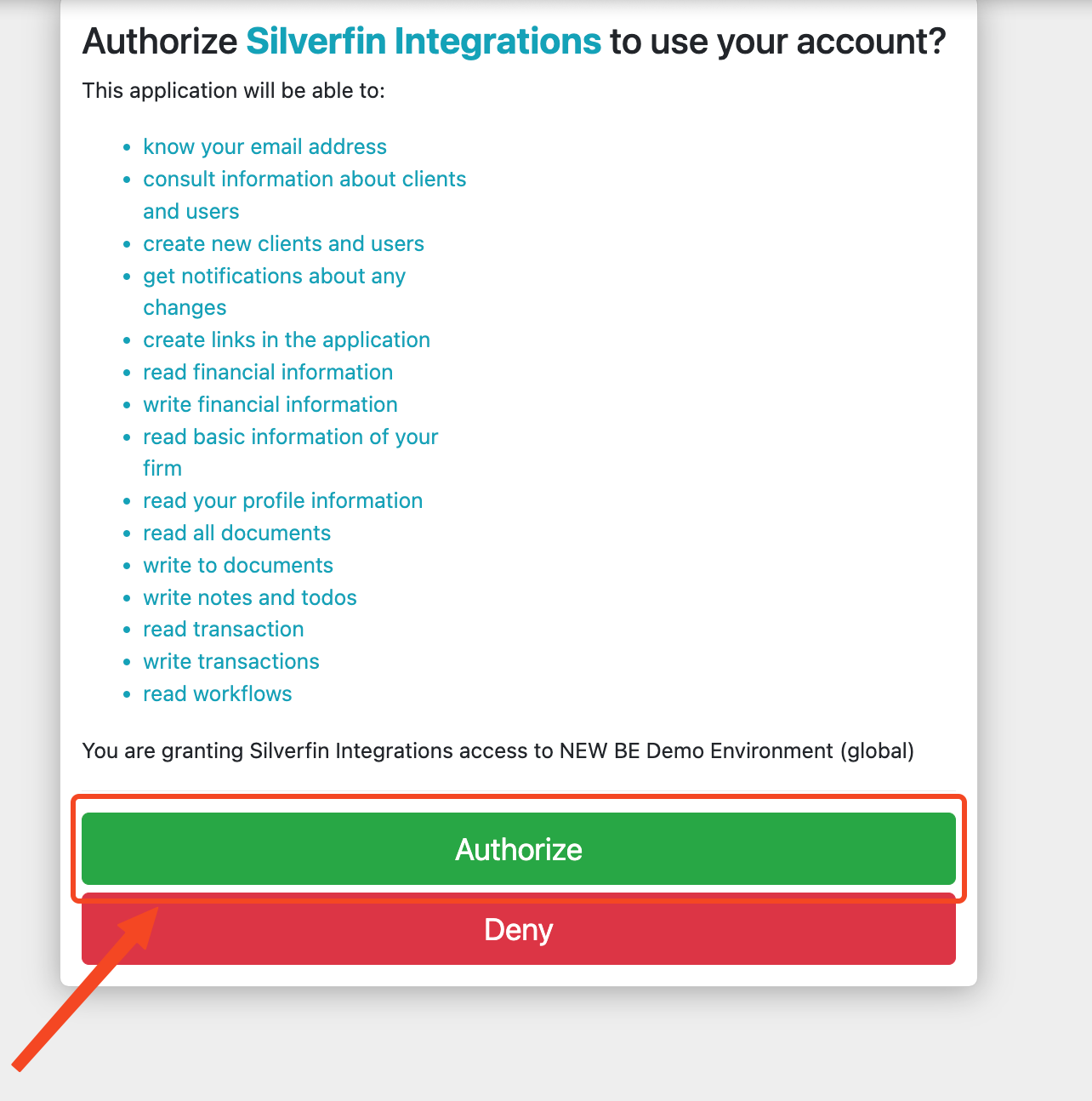 - As an admin user, navigate to https://integrations.getsilverfin.com/, log in and authorise your firm.