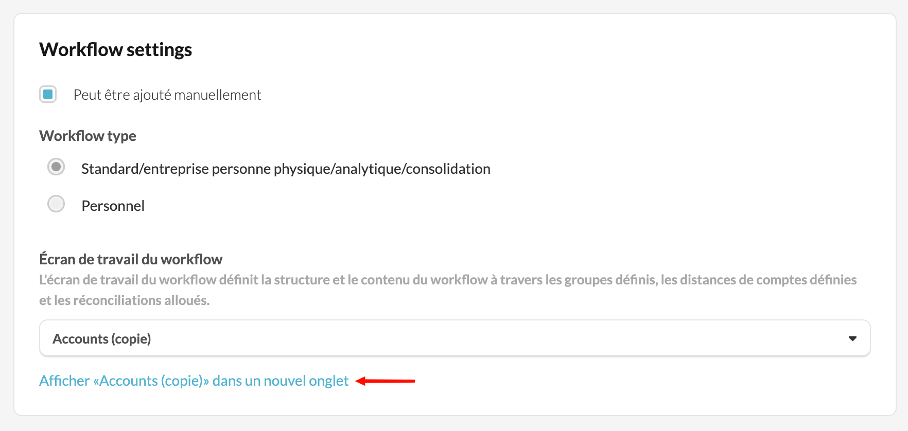 - Dans les Workflow settings, cliquez sur le lien Afficher « l'écran de travail du workflow » dans un nouvel onglet.