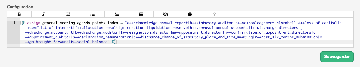 {% assign general_meeting_agenda_points_index = "a++acknowledge_annual_report|c++statutory_auditor|b++acknowledgement_alarmbell|d++loss_of_capital|e++conflict_of_interest|f++allocation_result|g++creation_liquidation_reserve|h++approval_annual_accounts|i++discharge_directors|j++discharge_accountant|k++discharge_auditor|l++resignation_director|m++appointment_director|n++confirmation_of_appointment_directors|o++appointment_auditor|p++declaration_remuneration|q++discharge_change_of_statutory_place_and_time_meeting|r++past_six_months_submission|s++gm_brought_forward|t++social_balance" %}