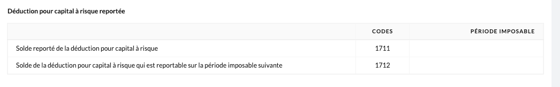 Le code 1711 peut être saisi dans le Calcul de l'impôt via « Déduction pour capital à risque reportée de manière illimitée » dans la première colonne.