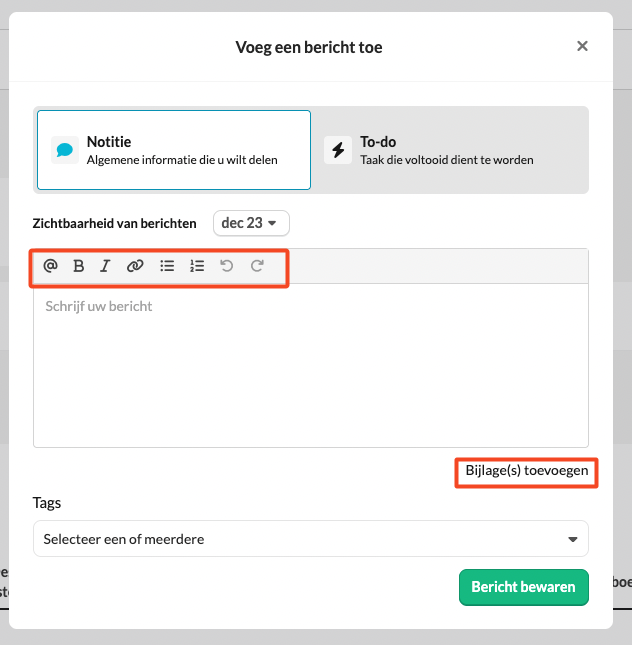 - Klik op 'Voeg een bericht toe' en selecteer een 'Notitie' of 'To-do'.