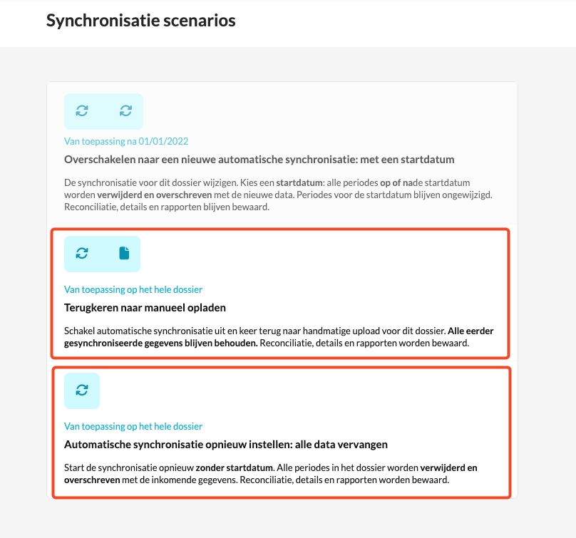 Het opnieuw opzetten van de synchronisatie zal alle bestaande grootboekgegevens in het dossier overschrijven met nieuwe data.