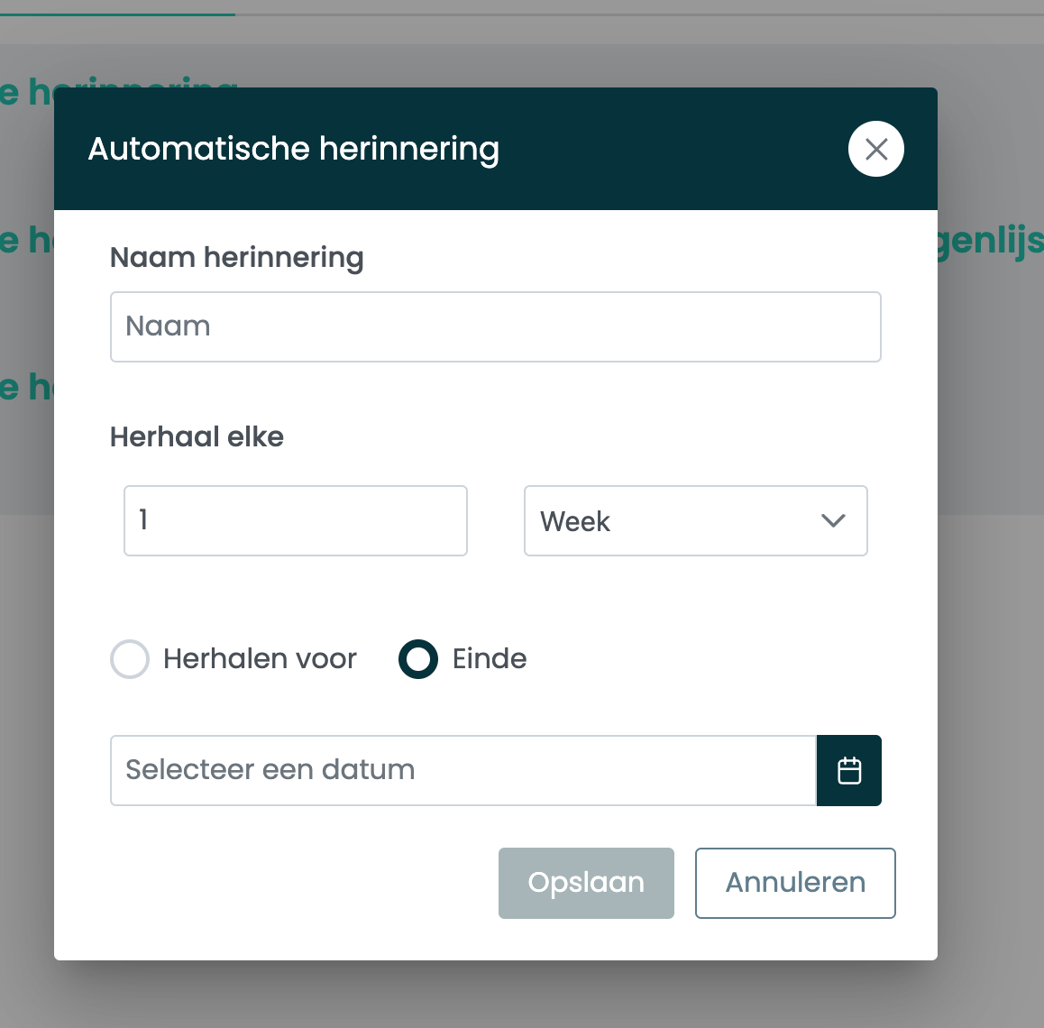 - Stel de frequentie van de herinneringen in (bijv. elke 1, 2 of 3 weken).