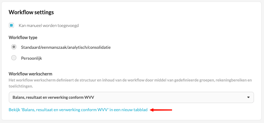 - Klik in de Workflow settings op de link Bekijk ‘workflow-werkvenster’ in een nieuw tabblad: